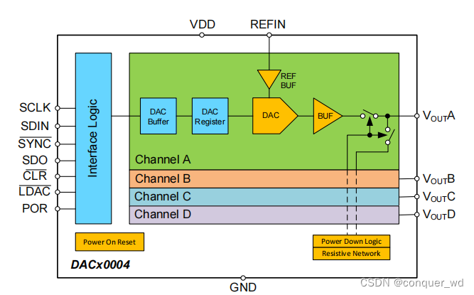 DAC6004相对比较简单,有4个配置通道,配置过程中使用的主要信号有SCLK 、SDIN、SDO、SYNC、LDAC以及通道的配置输出。
