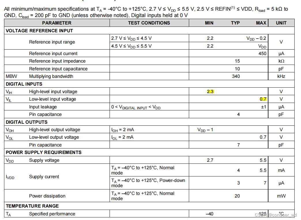 此处相对还是比较重要,因为牵扯到DAC数字端输入的最低和最高的电压要求,即要求DAC输入电压必须高于2.3v才可以表示某一个信号为高,低于0.7v才可以驱动信号为低电平,如下图黄色部分中,表示了DAC的驱动电压要求。