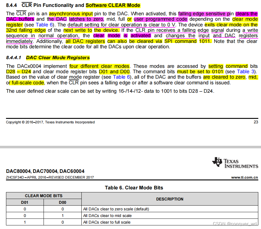 (2)CLR管脚:该管脚得作用是用来清除当前chan输出的电压到指定的电平,至于当拉低这个管脚之后chan的输出状态是多少与CLR寄存器的配置有关系,默认是清0
