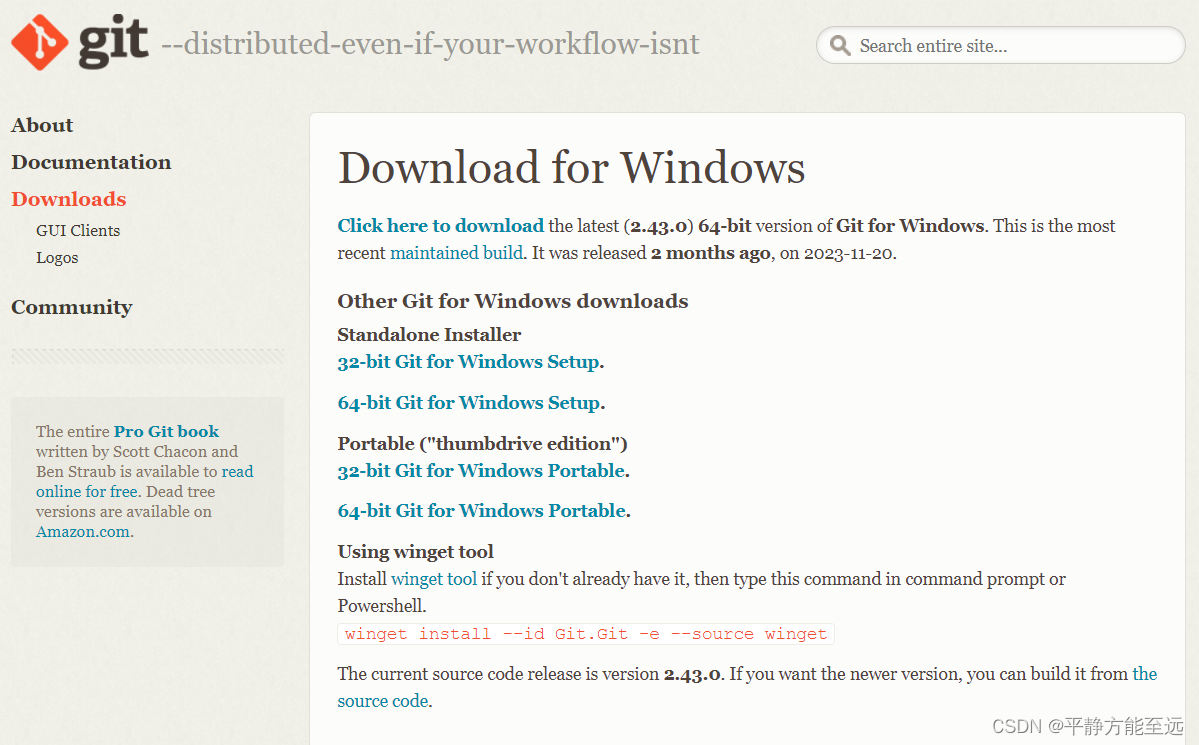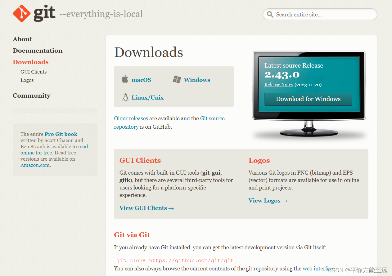 可以使用浏览器访问如下的网址,根据自己的操作系统,在Downloads选项卡中选择下载对应的 Git 安装包: