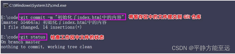 再次运行 git commit -m"提交消息"命令,即可将暂存区中记录的 index.html的快照,提交到 Git 仓库中进行保存: