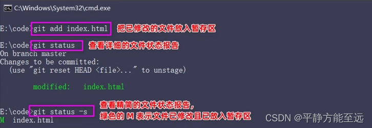 目前,工作区中的 index.html文件已被修改,如果要暂存这次修改,需要再次运行 git add 命令,这个命令是个多功能的命令,主要有如下3个功效: