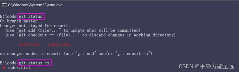 目前,index.html文件已经被 Git 跟踪,并且工作区和 Git 仓库中的 index.html文件内容保持一致。当我们修改了工作区中 index.html的内容之后,再次运行 git status 和 git status -s 命令,会看到如下的内容: