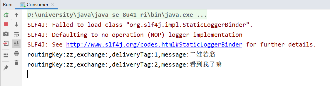 System.out.println("routingKey:"+routingKey+",exchange:"+exchange+",deliveryTag:"+deliveryTag+",message:"+message);