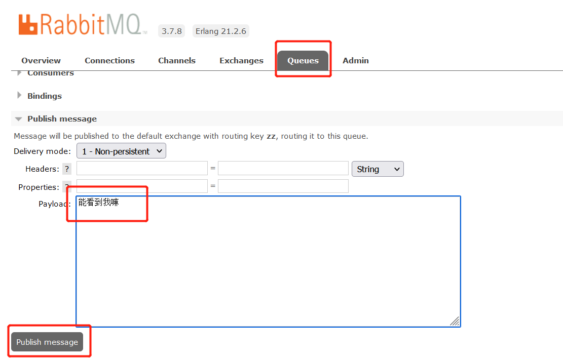 打开Queue,点击自己的队列,发送消息