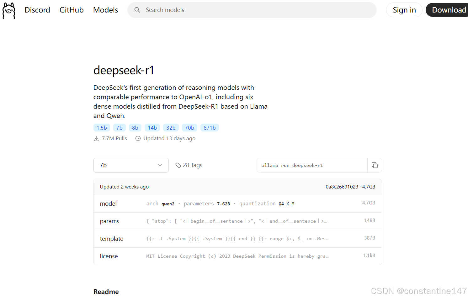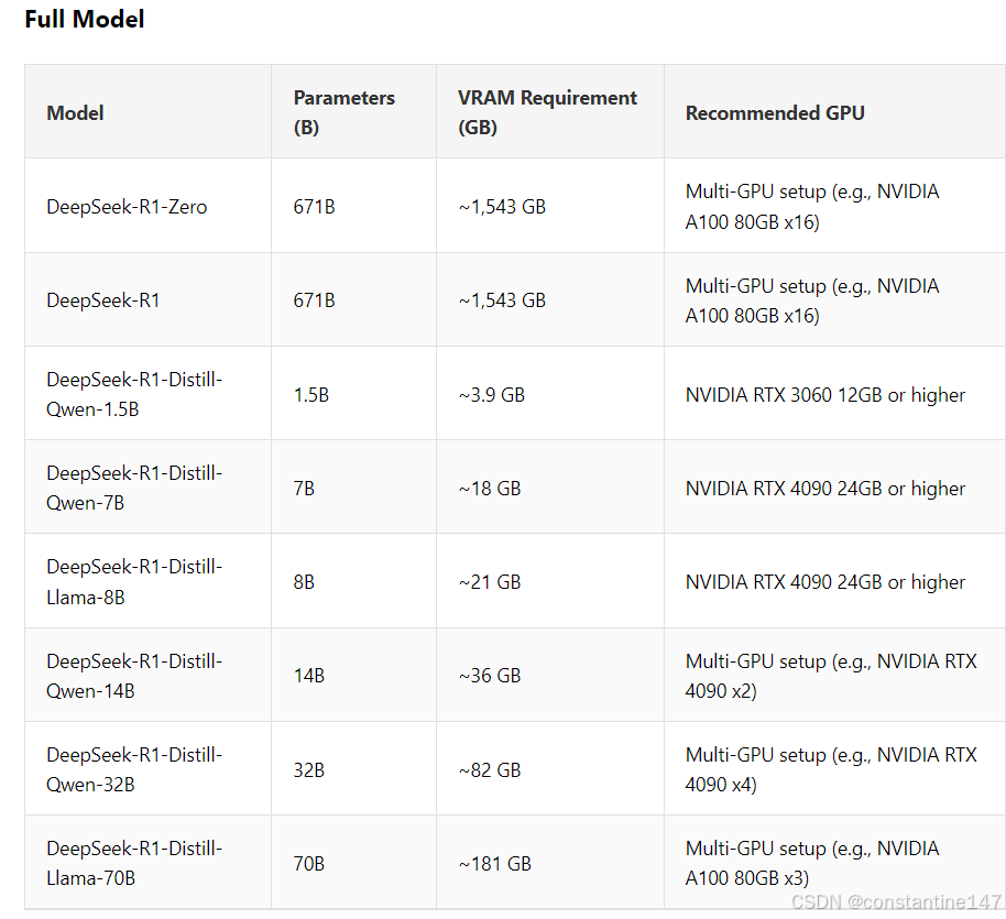 这里注意模型版本的选择,要根据自己的电脑性能来下载,如果资源不足,下载了也会跑不起来,我这里我选择的是适中的模型。数字越大,代表参数越多,所需资源也越多,1.5b=15亿参数,其他自己换算下,对应的资源和模型我放个图,大家自己对应下。参考:GPU System Requirements for Running DeepSeek-R1