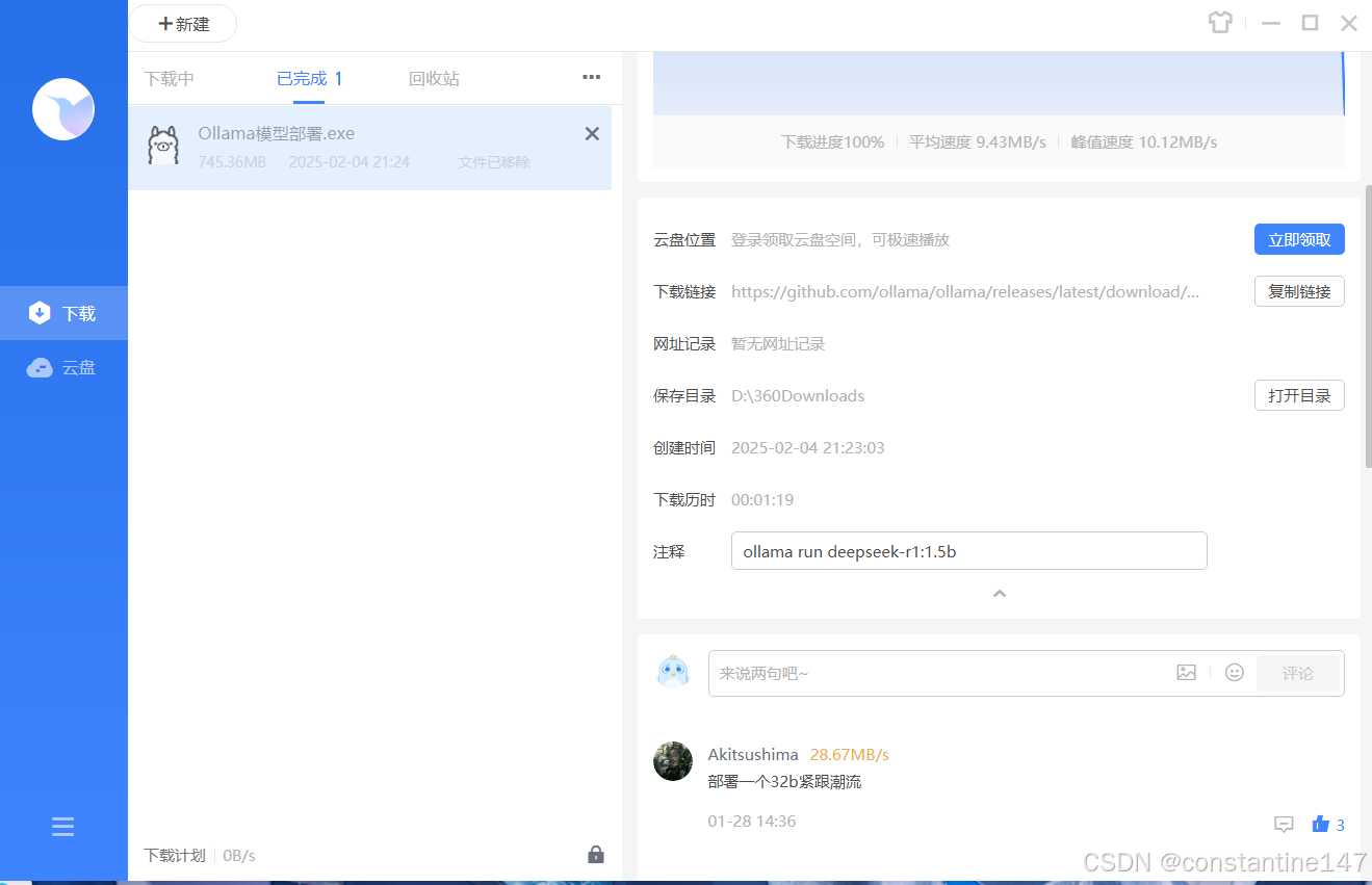 官网Ollama:下载路径用到了github的链接,没有科学上网方法的话,建议走代理下载,或者复制下载链接后试试使用迅雷下载器