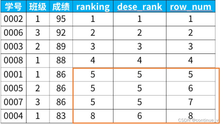 rank函数:会根据分组字段相同的数据排名,相同数据排名相同,不同数据会自动顺延排名数;