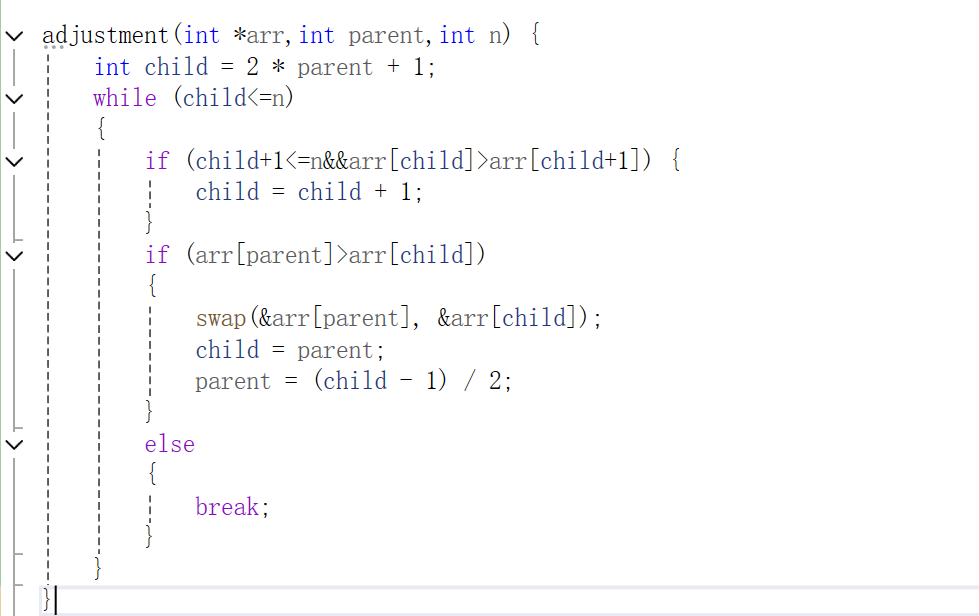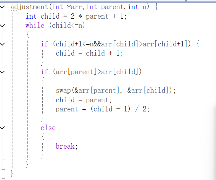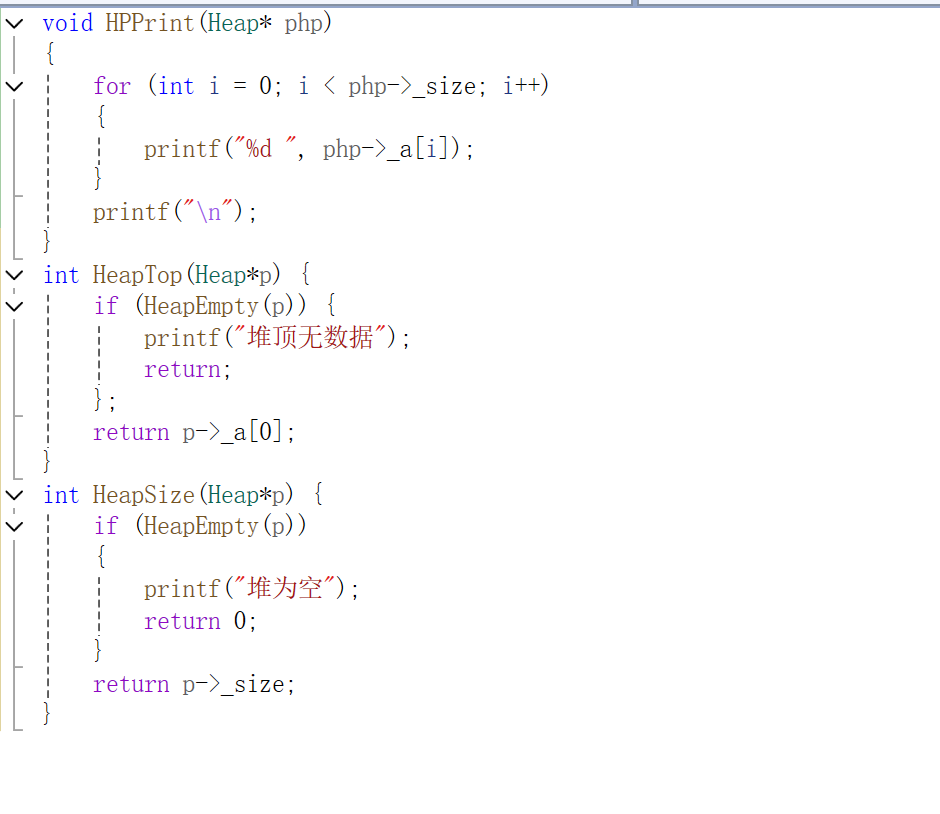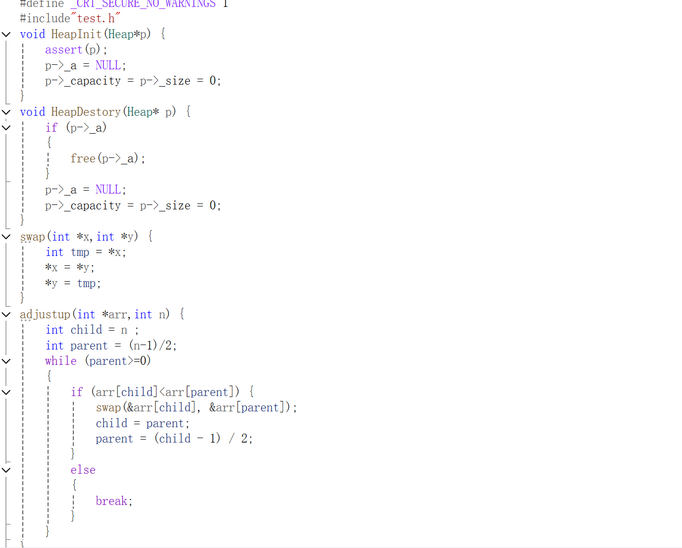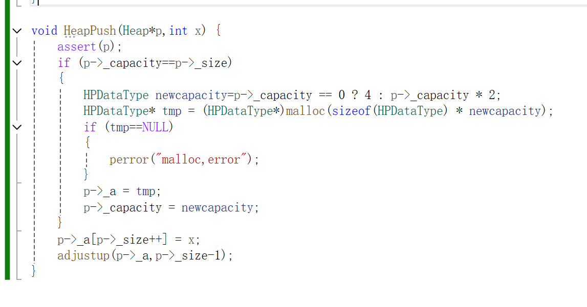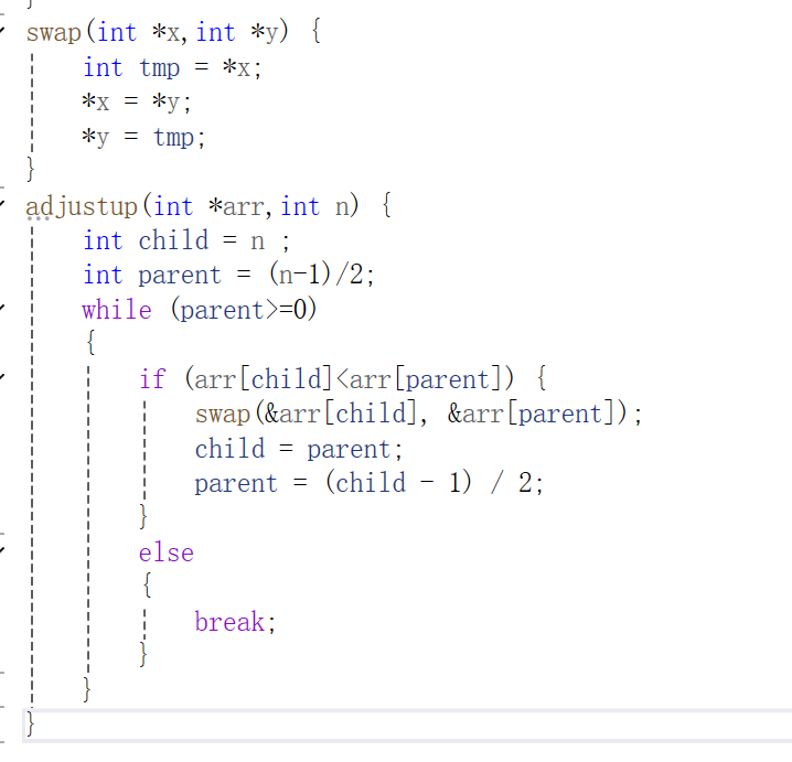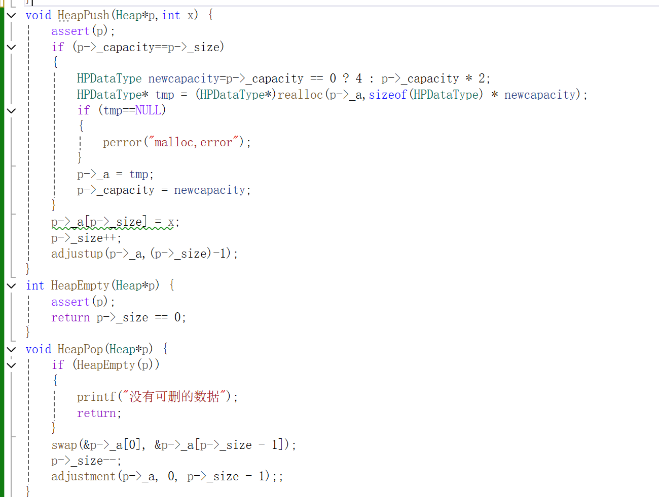 用线性表先判断其是否有足够的容量,如果没有则需要扩容,扩容后添加要插入的数字。如果按线性表进行添加,不会满足堆的定义,这时我们需要调整,建小堆,需要将最小的值调到堆顶,这时需要向上排序。直接构建一个函数功能向上排序,将最新的线性表下标与数组传入函数中,其中儿子结点是线性表中传入的下标,父亲结点则是儿子节点减一在除以二,用while循环的条件是父节点>=0进入,然后进行判断,如果儿子结点是大于父节点的则不需要交换,直接break,反之则需要交换。如果要构成大堆,直接将排序中小于号改成大于号即可。