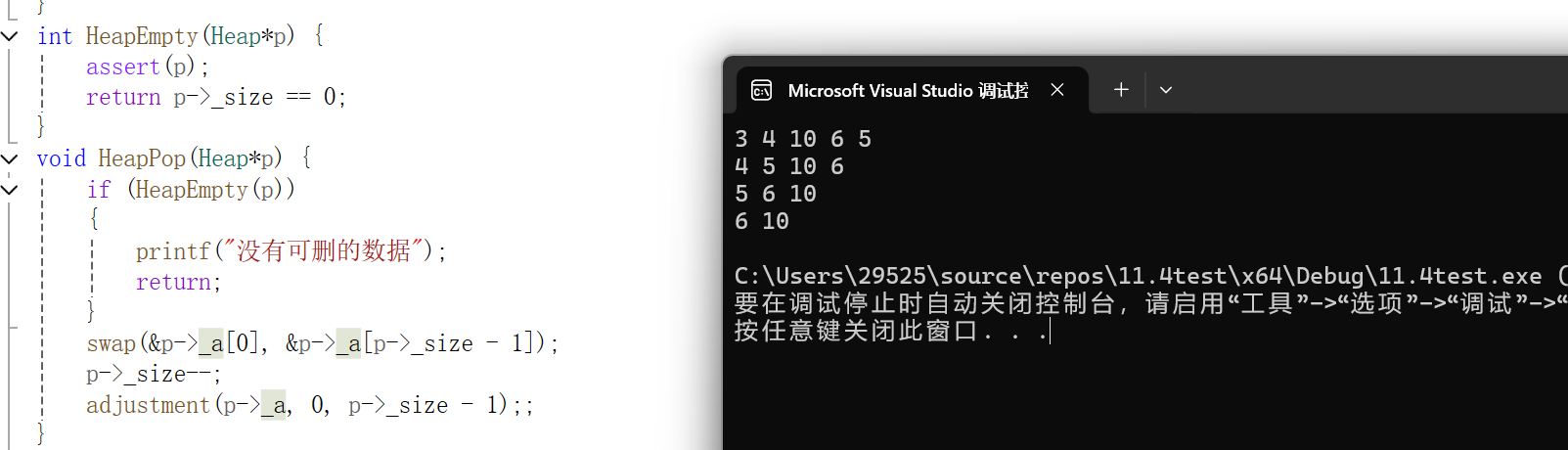 先判断其是否满足删除的条件,条件分别是该指针是否存在或者指针内size的值是否为0.因为堆的删除主要是删除堆顶元素,需要将末尾位置的值和其调换,并且size需要减一,而后经过向下调整重新达到满足小堆的条件。