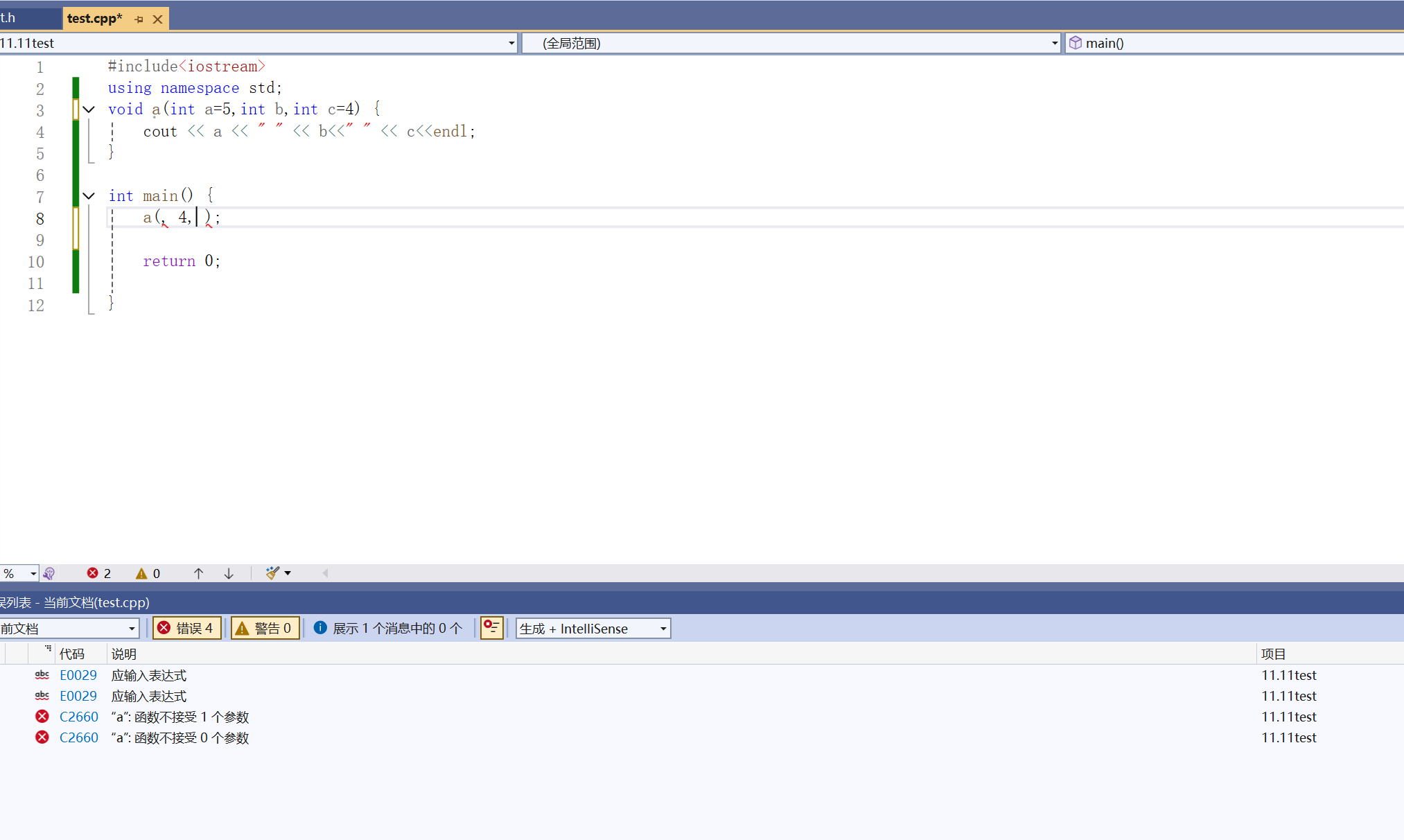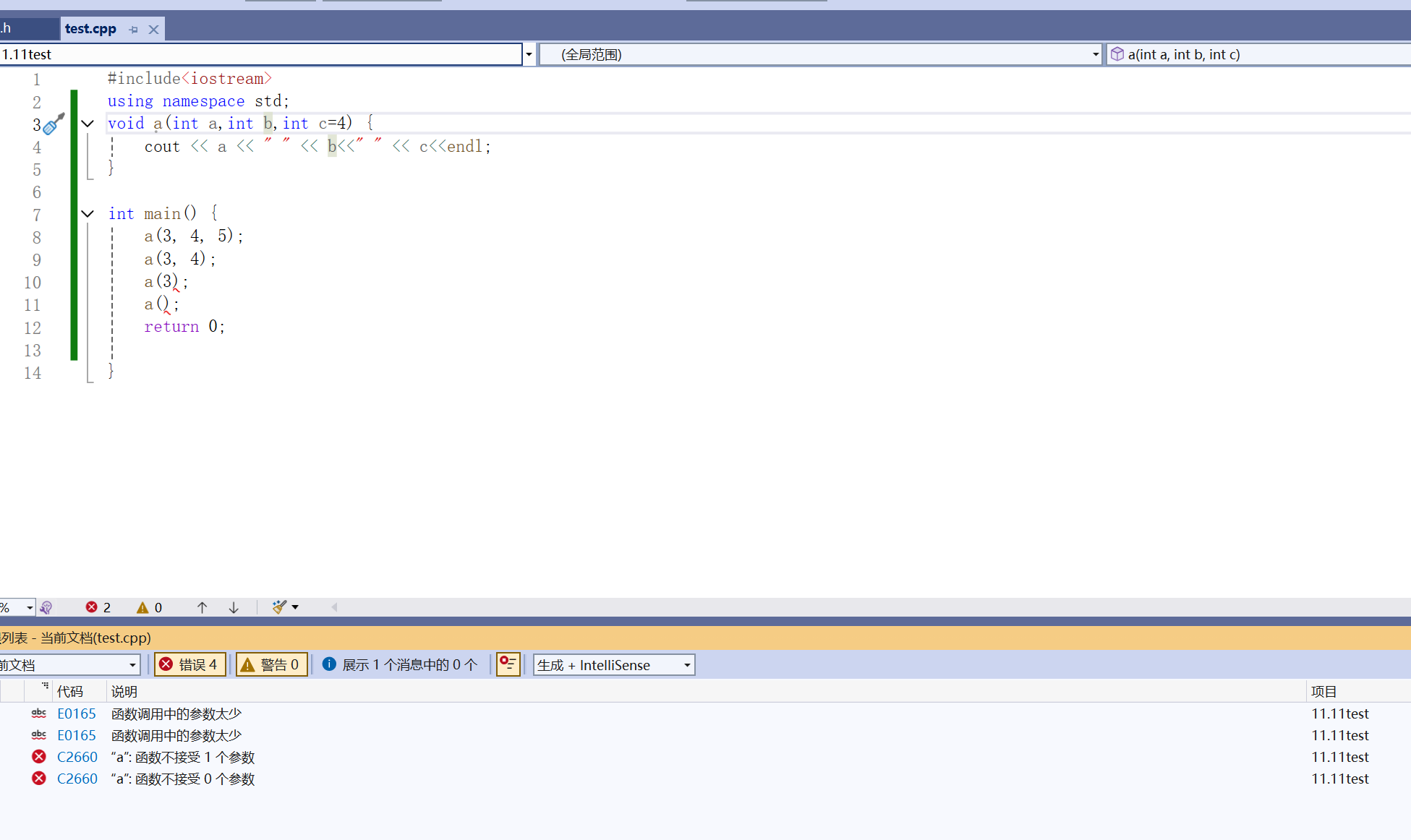 由下图可知,当改为半缺省时我们需要对其没给的参数进行传参,否则就会报错。无法调用该函数。