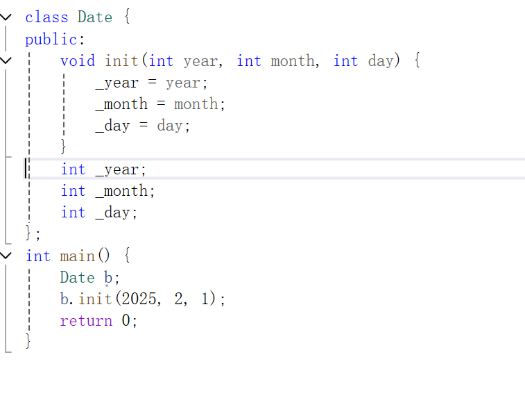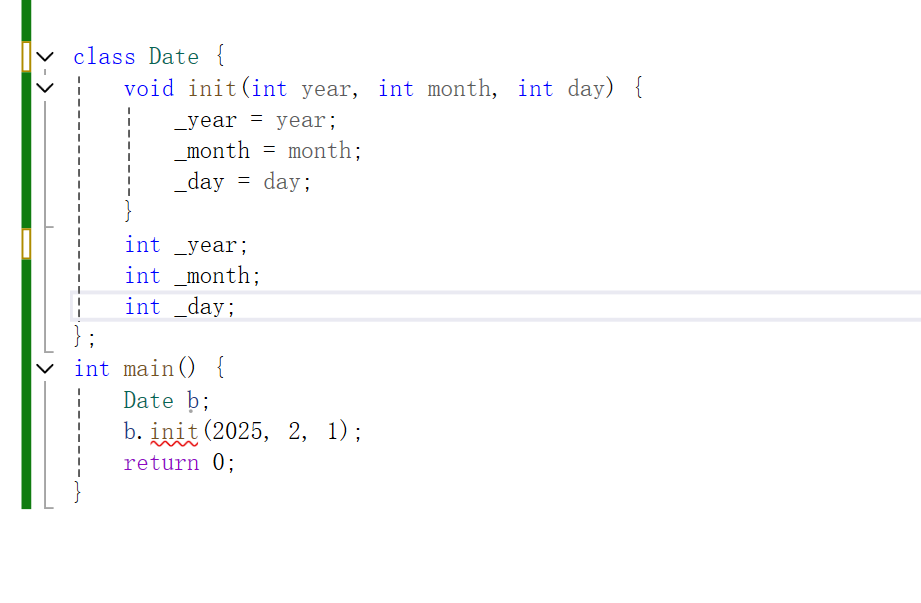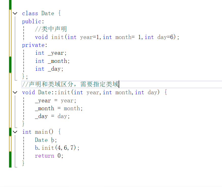 类域的编译查找规则,上面程序中init如果不指定类域Date,那么编译器就会把init当成全局函数,那么编译时,找不到类中成员的声明和定义在哪里,就会报错。指定类域就能够找到init是成员函数,当前域找不到,就会到类域里去找