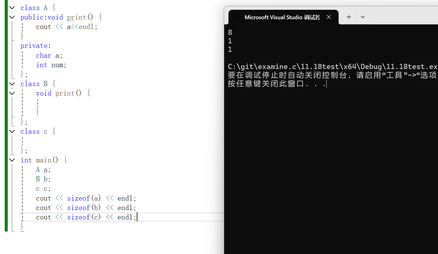 根据这张图我们可以发现第一个a的大小为8个字节,跟随内存对齐原则的计算,计算出来的字节大小。而b中根本没有变量只有函数,c中函数和变量都没有,而他们的字节大小为1。字节1是为了代表该对象存在。
