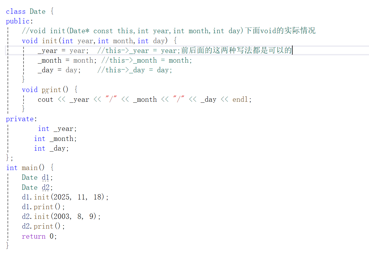 (1)Date类中有init与print两个成员函数,函数体中没有关于不同对象的区分,那当d1调用init与print时,该函数如何判断应该访问哪个对象,c++给出this指针解决该类问题