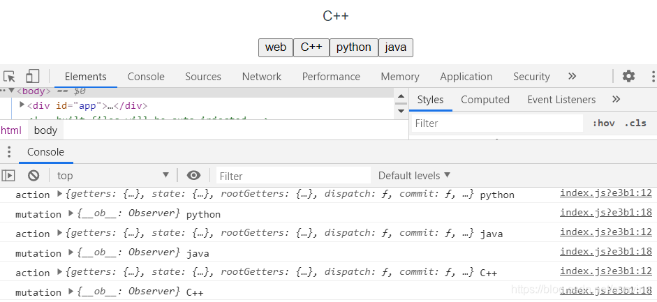 尤大大为我们提供了封装好的一些方法,如上面的 ...mapMutations() ,意思是 mutations 里有一个 changeJob ,我们将其映射到该组件的一个 changeJob的方法里,这样就可以直接调用 changeJob 方法并传值了