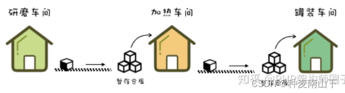 为了解决这个问题,小袁在每组传送的下游带配备了一个暂存半成品的仓库,这样上游工人就不用等待下游工人有空,任何时间都可以把加工完成的半成品丢到传送带上,无法接收的货物被暂存在仓库中,下游工人可以随时来取。传送带配备的仓库实际上起到了“通信”过程中“缓存”的作用。