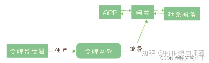 令牌桶可以简单地用一个有固定容量的消息队列加一个“令牌发生器”来实现:令牌发生器按照预估的处理能力,匀速生产令牌并放入令牌队列(如果队列满了则丢弃令牌),网关在收到请求时去令牌队列消费一个令牌,获取到令牌则继续调用后端秒杀服务,如果获取不到令牌则直接返回秒杀失败。