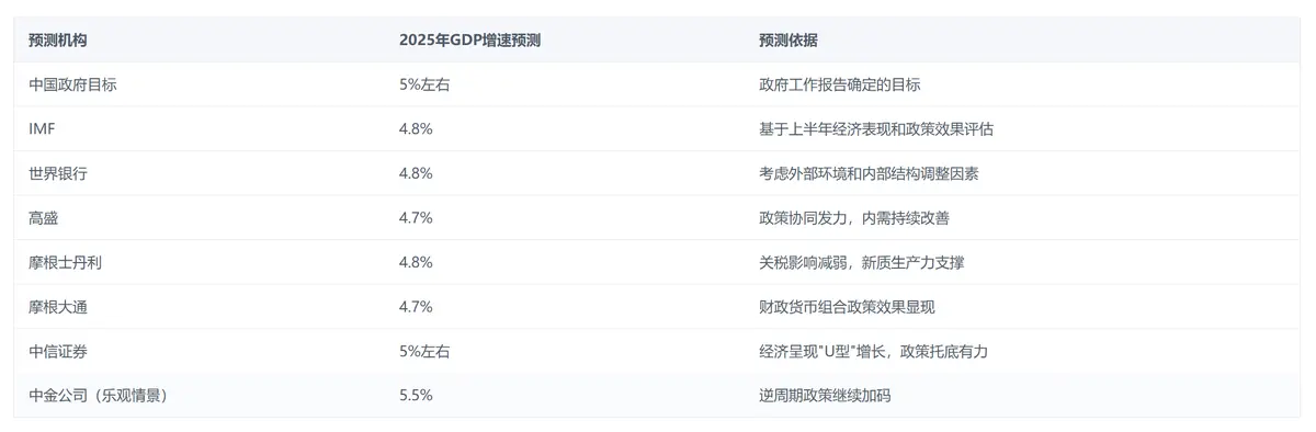 综合国内外主要机构的预测,对 2025 年中国全年 GDP 增长的预测呈现以下特点: