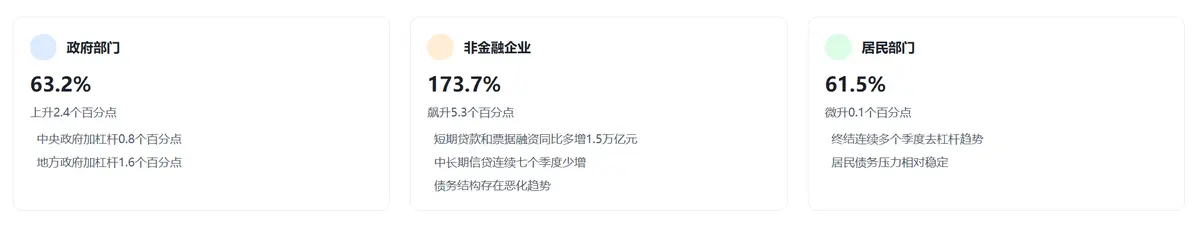 非金融企业杠杆率飙升 5.3 个百分点至 173.7%,但债务结构存在恶化趋势,短期贷款和票据融资同比多增 1.5 万亿元,而中长期信贷连续七个季度少增