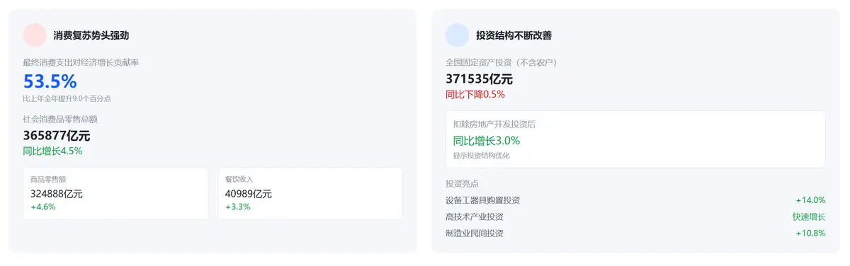 从增长动力看,内需特别是消费对经济增长的拉动作用显著增强,最终消费支出对经济增长贡献率达到 53.5%。新质生产力成为推动高质量发展的重要引擎,高技术制造业、数字经济、绿色发展等新兴产业蓬勃发展。