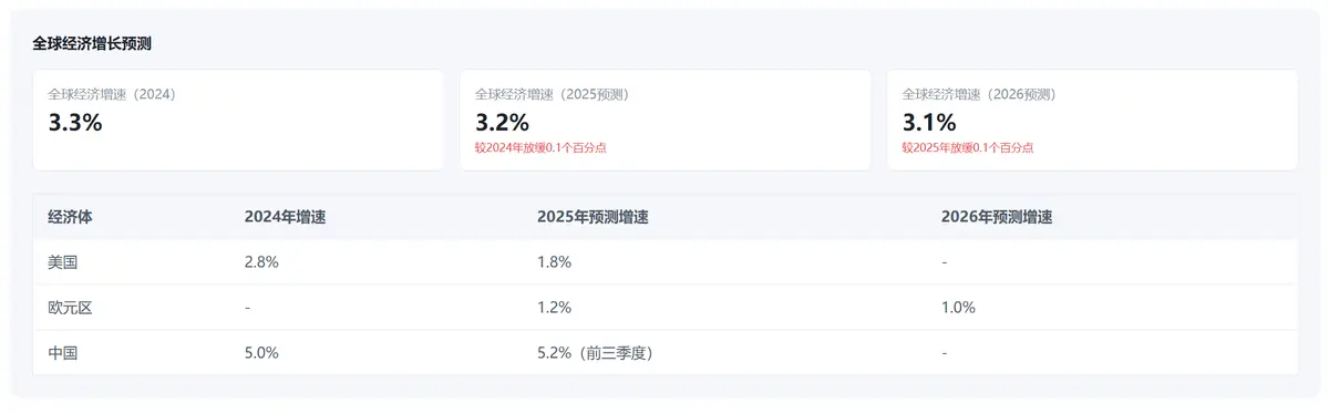 全球经济增长放缓但仍有韧性。根据国际货币基金组织(IMF)最新预测,全球增长预计将从 2024 年的 3.3% 减速至 2025 年的 3.2% 和 2026 年的 3.1%。主要经济体增长分化明显: