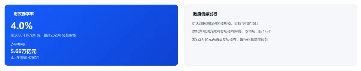财政赤字率提升至 4% 左右,赤字规模达 5.66 万亿元,比上年增加 1.6 万亿元。这是 2008 年积极财政政策实施以来的最高水平,超过 2020 年疫情冲击时 "3.6% 以上" 的赤字率水平。