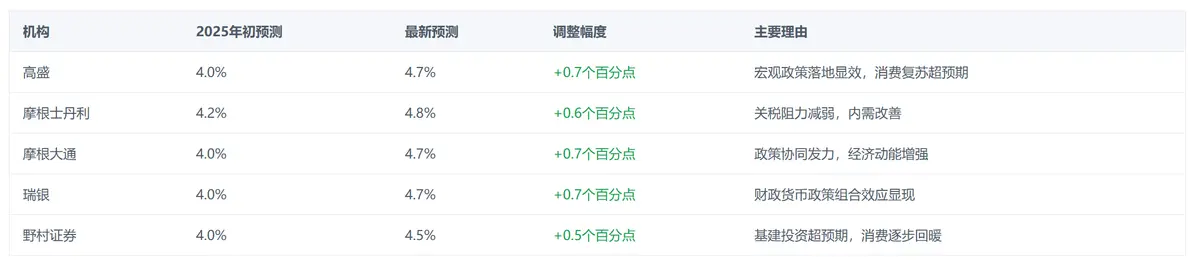 这些国际投行的预测普遍在 4.5%-4.8% 之间,较年初预测上调了 0.5-0.7 个百分点,主要基于中国宏观政策落地显效、消费复苏超预期、中美经贸关系缓和等积极因素。