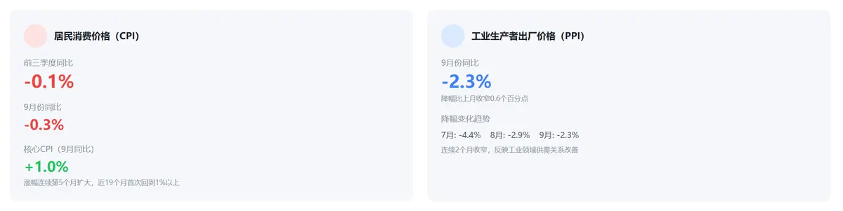 2025 年前三季度,中国物价水平总体保持稳定,通胀压力温和可控。全国居民消费价格(CPI)同比下降 0.1%,但扣除食品和能源的核心 CPI 上涨 0.6%,涨幅比上半年扩大 0.2 个百分点。