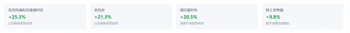 消费品以旧换新政策持续显效,限额以上单位家用电器和音像器材类、家具类、通讯器材类、文化办公用品类商品零售额分别增长 25.3%、21.3%、20.5%、19.9%