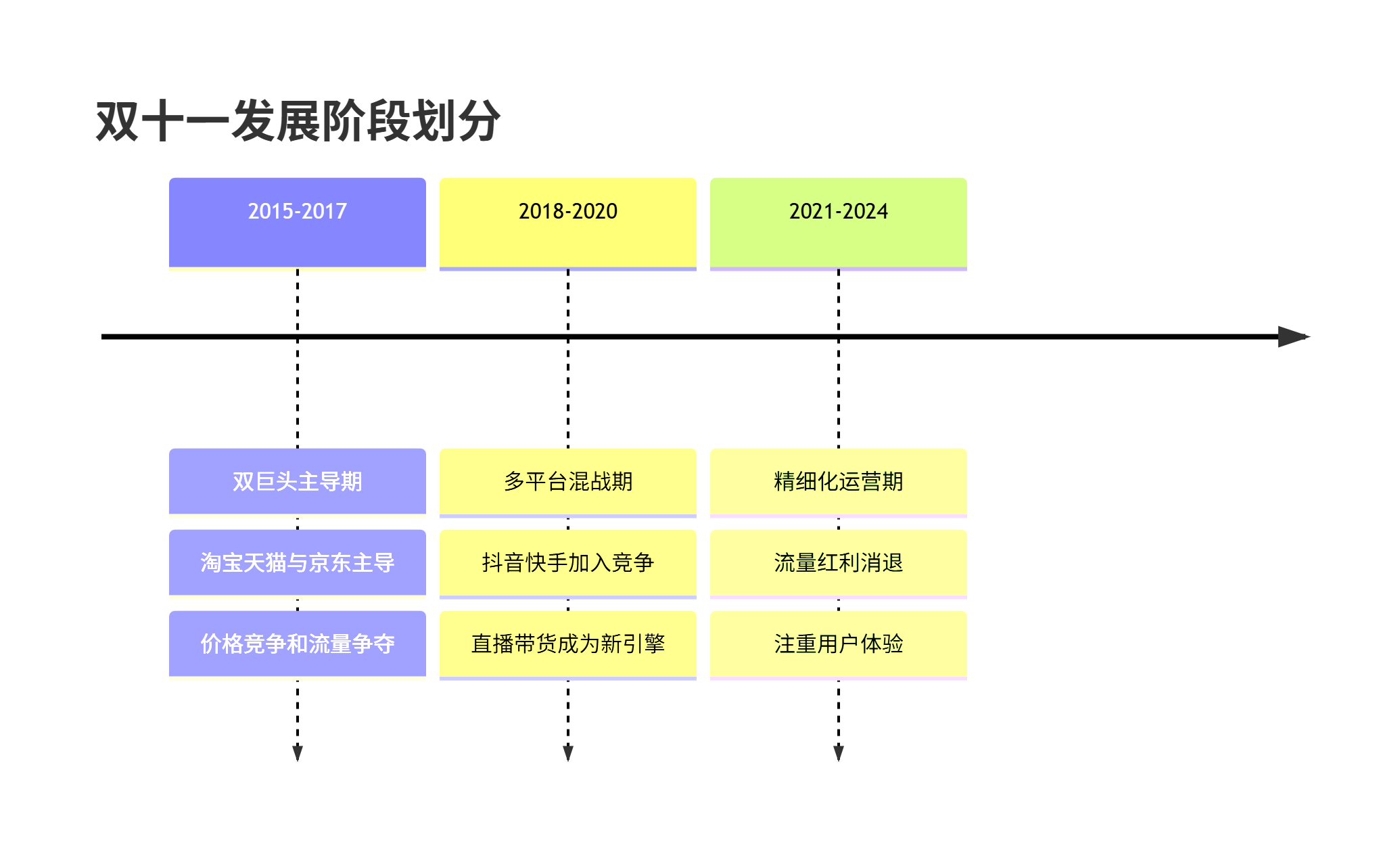 从 2015 年到 2024 年,双十一战术经历了三个发展阶段:双巨头主导期(2015-2017)、多平台混战期(2018-2020)、精细化运营期(2021-2024)。每个阶段都有其独特的特征和竞争重点,反映了电商行业从粗放式增长向精细化运营的转变。