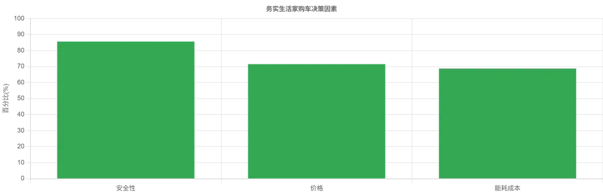 务实生活家的购车决策呈现出显著的理性化特征。根据艾媒咨询的最新调研,消费者购车决策的前三大关注因素为:安全性(85.67%)、价格(71.59%)和能耗成本(68.85%)。在选购新能源汽车时,汽车安全性与最大续航里程均以 36.55% 的占比并列第一,紧随其后的是新能源汽车价格(36.44%)。