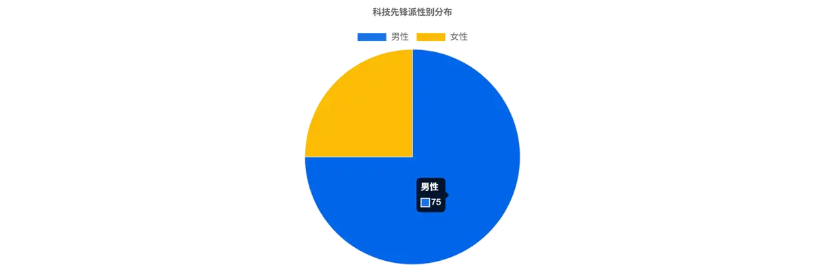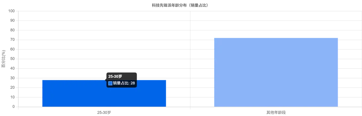 从人口统计学特征看,科技先锋派以25-35 岁的年轻群体为主,其中 25-30 岁消费者贡献了 28% 的销量。这一群体中,男性占比约为 75%,女性占比 25%,呈现出明显的性别差异。在收入水平方面,他们多为本科以上学历、年收入 30 万以上的互联网从业者或科技公司高管,家庭年收入普遍在 30-80 万元之间。