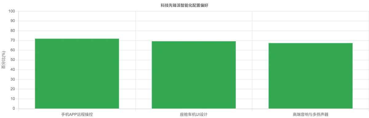 科技先锋派的核心购车动机体现在对智能化配置的极致追求。调研数据显示,该群体中 87% 认为 “智能座舱比发动机参数更重要”。他们将智能化配置(如语音交互、自动泊车)作为购车首要考量,对科技感强的车型接受度更高。具体而言,71.9% 的用户偏好手机APP远程操控,69.3% 的用户对座舱车机 UI 设计有高要求,67.4% 的用户追求高端音响与多扬声器。