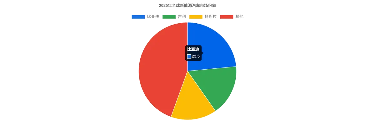 全球市场格局:比亚迪以 23.5% 的市占率蝉联全球销冠,吉利以 16.8% 超越特斯拉(15.2%)首次跻身全球第二,中国车企贡献了全球新能源汽车销量增量的 62%。