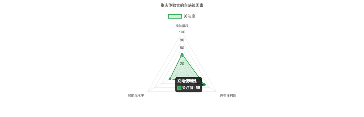 在购车决策因素上,生态体验官更注重车辆的多功能性和适应性。他们关注的核心要素包括:续航里程(45%)、充电便利性(65% 的受访者将 “充电桩覆盖率” 列为购车决策前三位因素)、智能化水平(35%)。特别值得注意的是,这类人群对车辆的越野性能、通过性有较高要求,同时也看重车辆的环保属性。