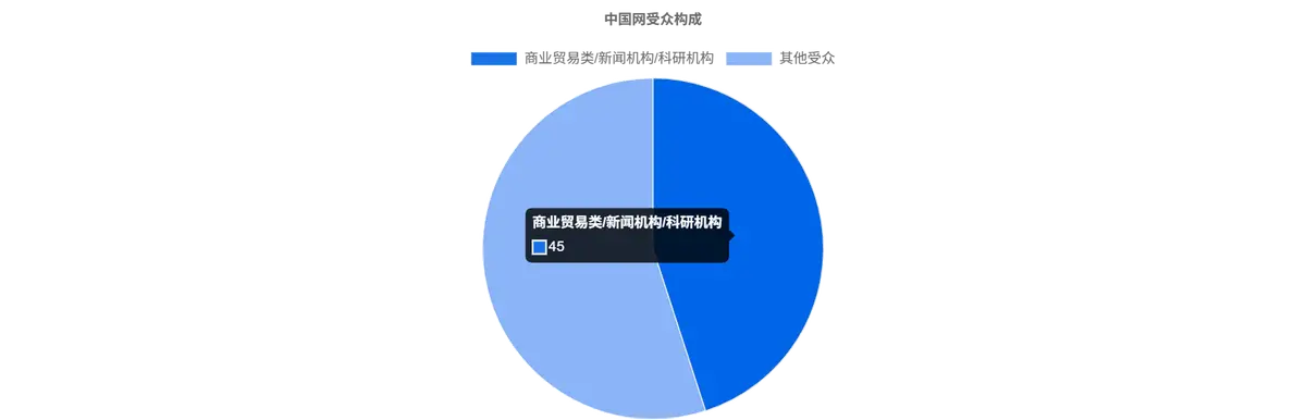 中国网的受众特征呈现出“高学历、高层次、高影响力” 的三高三特征。其受众年龄基本在 22-45 岁之间,文化水平、社会层次整体较高。商业贸易类、新闻机构以及研究中国经济发展和动态的社会科研机构类的读者,占受众总数的 45%。在内容偏好上,中国网适合发布政策解读、国际关系、国情资讯,内容需严谨,具有宏观视野。