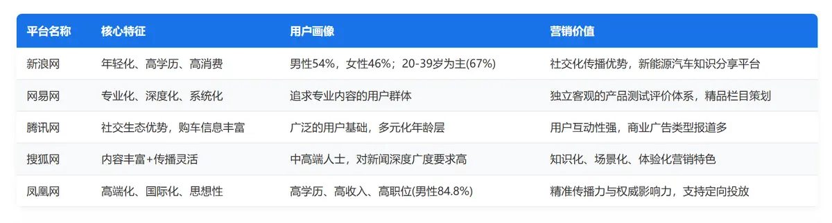新浪网、网易网、腾讯网构成了中国互联网的第一梯队商业门户,在新能源汽车营销中具有巨大的流量优势和传播影响力。