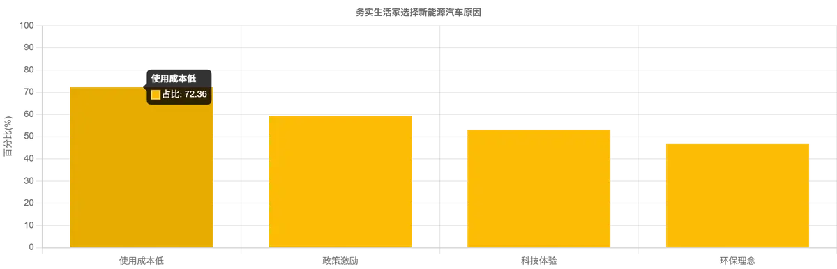 这一群体选择新能源汽车的核心原因包括:使用成本低(72.36%)、政策激励(59.36%)、科技体验(53.18%)、环保理念(47.01%)。特别值得关注的是,新能源汽车早已告别 “政策依赖”,2025 年仅有 18% 的消费者将政策优惠列为首要购车因素。