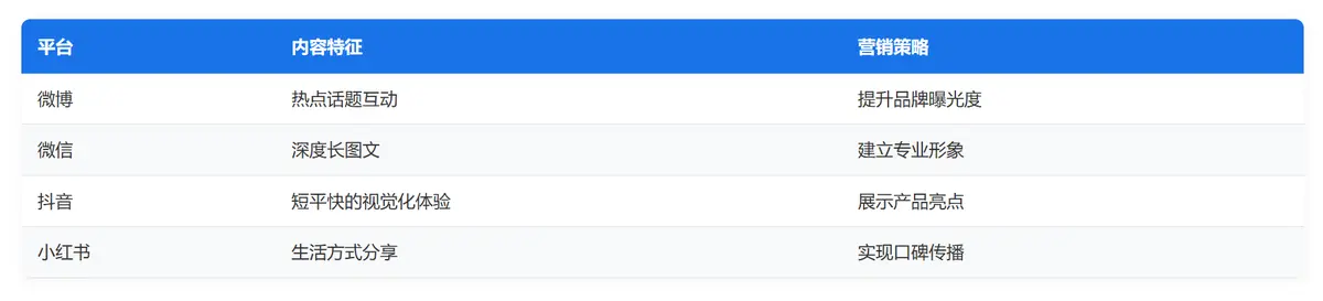 基于七大平台的不同特征,建议构建 “核心平台 + 辅助平台” 的内容矩阵 :