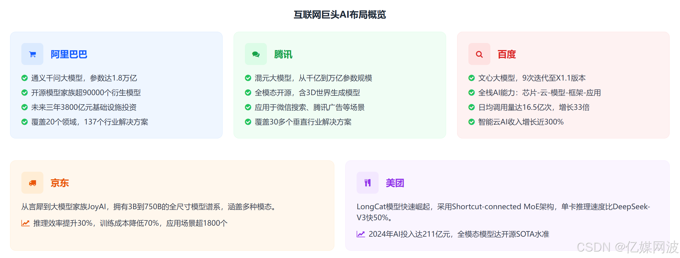 互联网巨头、传统行业巨头和新兴创业公司形成了多层次、差异化的竞争格局。阿里巴巴通过开源战略构建生态优势,腾讯稳健推进多模态布局,百度坚持全栈 AI 战略,华为走软硬一体路线,字节跳动展现强大的产品化能力,新兴 “六小龙” 在技术创新上各有特色。这种多元化竞争格局推动了中国 AI 技术的快速进步。