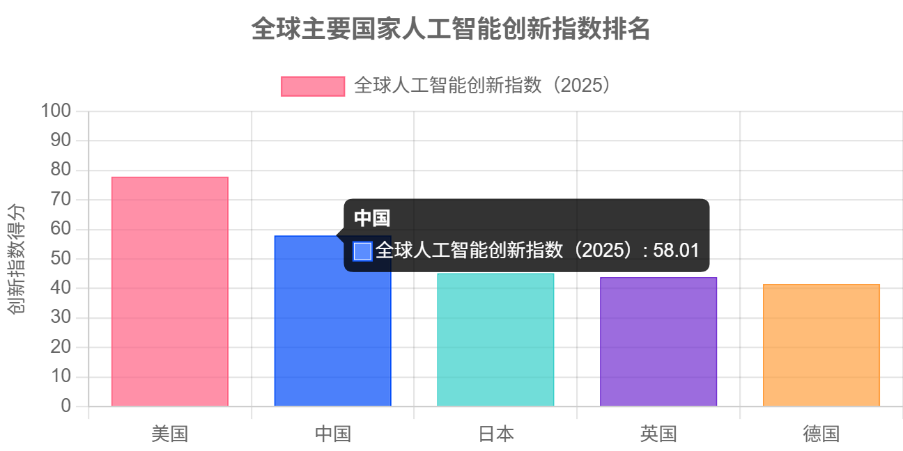 - 《全球人工智能创新指数报告 2025》:美国 77.97 分排名第一,中国 58.01 分排名第二,两国稳居第一梯队
