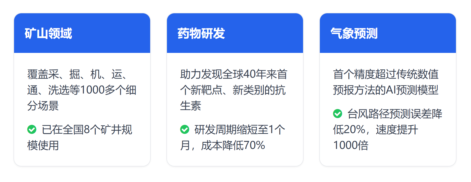 - 气象预测:首个精度超过传统数值预报方法的 AI 预测模型,台风路径预测误差降低 20% 以上,预测速度提升 1000 倍