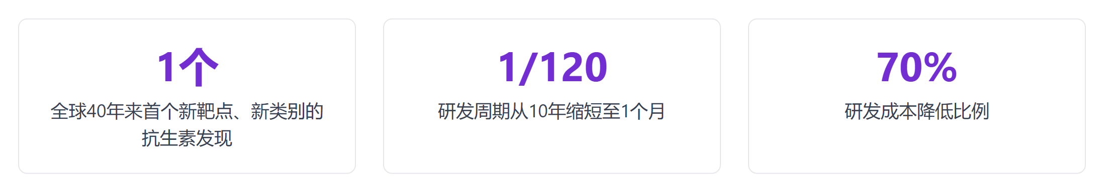 - 药物研发:助力发现全球 40 年来首个新靶点、新类别的抗生素,将先导药物研发周期缩短至 1 个月,成本降低 70%
