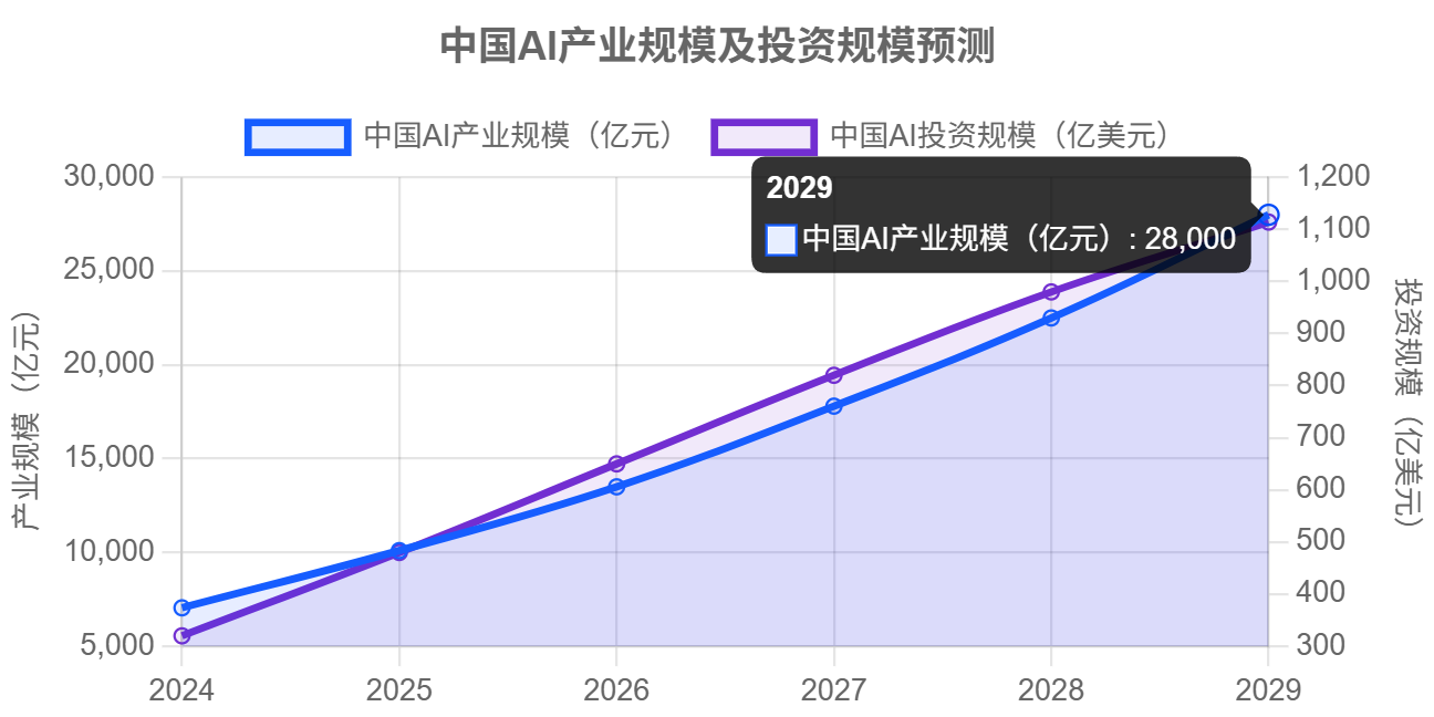 - 预计到 2029 年中国人工智能总投资规模将达 1114 亿美元,五年复合增长率为 25.7%