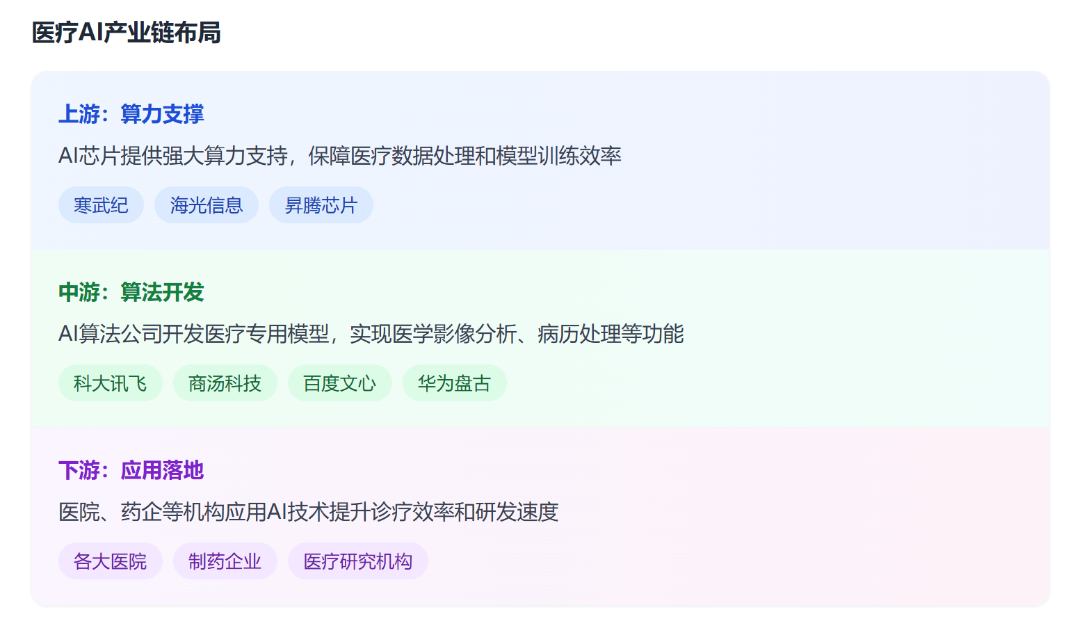 - 中游:AI 算法公司(如科大讯飞、商汤科技)开发医疗专用模型