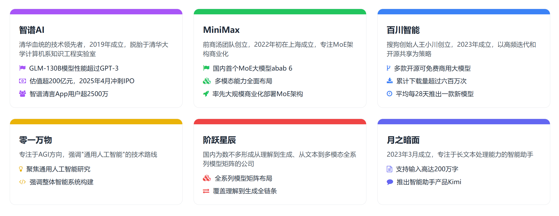 中国大模型初创公司以 “六小龙“(智谱 AI、MiniMax、百川智能、零一万物、阶跃星辰、月之暗面)为代表,展现出强大的创新活力和差异化竞争策略。
