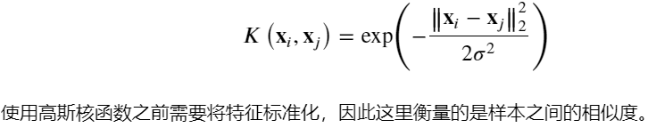 高斯核函数(Gaussian Kernel),在SVM中也称为径向基核函数(Radial Basis Function,RBF),它是非线性分类SVM最主流的核函数。表达式为: