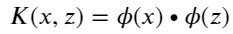 假设𝜙是一个从低维的输入空间𝜒(欧式空间的子集或者离散集合)到高维的希尔伯特空间的H映射。那么如果存在函数𝐾(𝑥,𝑧),对于任意𝑥,𝑧∈𝜒,都有核函数:![]()