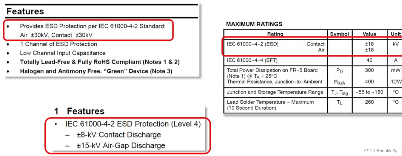 既然TVS管是作为ESD保护,则首先应该关注ESD保护等级,这个可以在datasheet中找到相关信息,如下:(目前市面上的TVS管基本都能满足或超过IEC61000的最高等级)