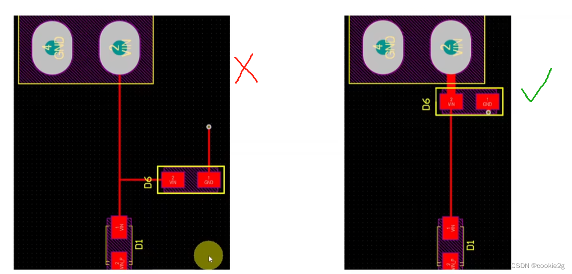 - TVS管的引脚走线尽可能的保持低阻抗,因此最好使用短而粗的走线